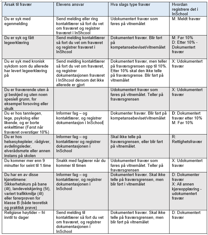 | Du er syk og fått legeerklæring | Send melding kontaktlærer så fort du vet om fraværet og registrer fraværet i InShcool | Dokumentert fravær. Blir ført på kompetansebeviset/vitnemålet | M: Før 10%